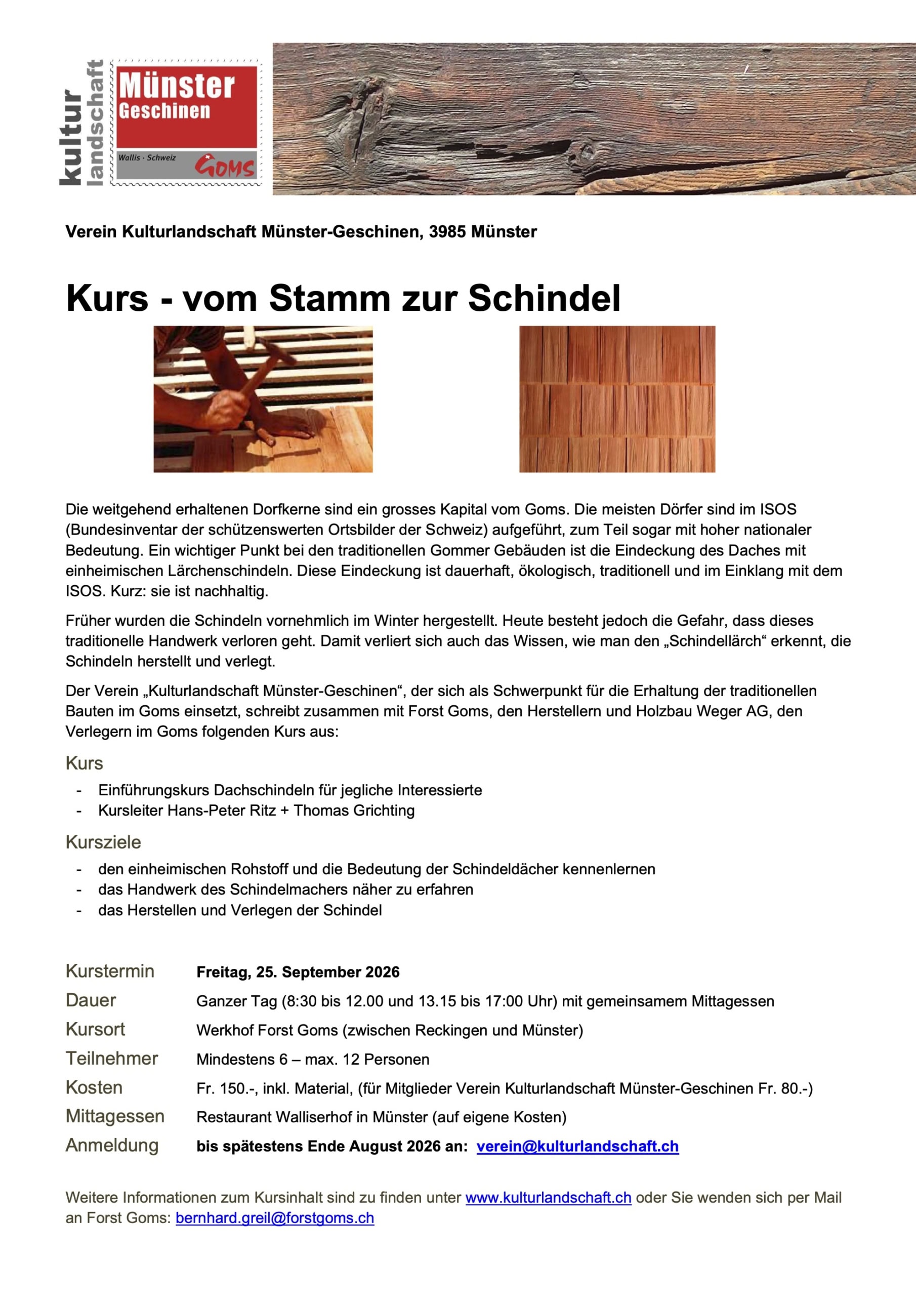 Am 12. und 13. September 2025 öffnen Forst Goms, Holzbau Weger, Valais Pellets und die Sägerei Zanella gemeinsam ihre Türen. Unter dem Motto Nachhaltig Planen und Bauen – Schweizer Holz aus der Region für Ihr Bauvorhaben – vom Wald bis zum Tisch dreht sich zwei Tage lang alles ganz ums Holz. Ziel der Tage des Schweizer Holzes ist es, den Kreislauf des einheimischen Holzes erlebbar zu machen: vom Wald über die Verarbeitung bis zum fertigen Produkt. Der Anlass richtet sich an alle – von Neugierigen über Fachleute bis hin zu Familien. Kommen Sie vorbei und lernen Sie vier starke Betriebe kennen, die täglich mit und für das Schweizer Holz arbeiten.